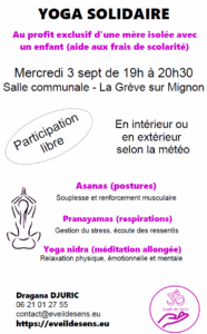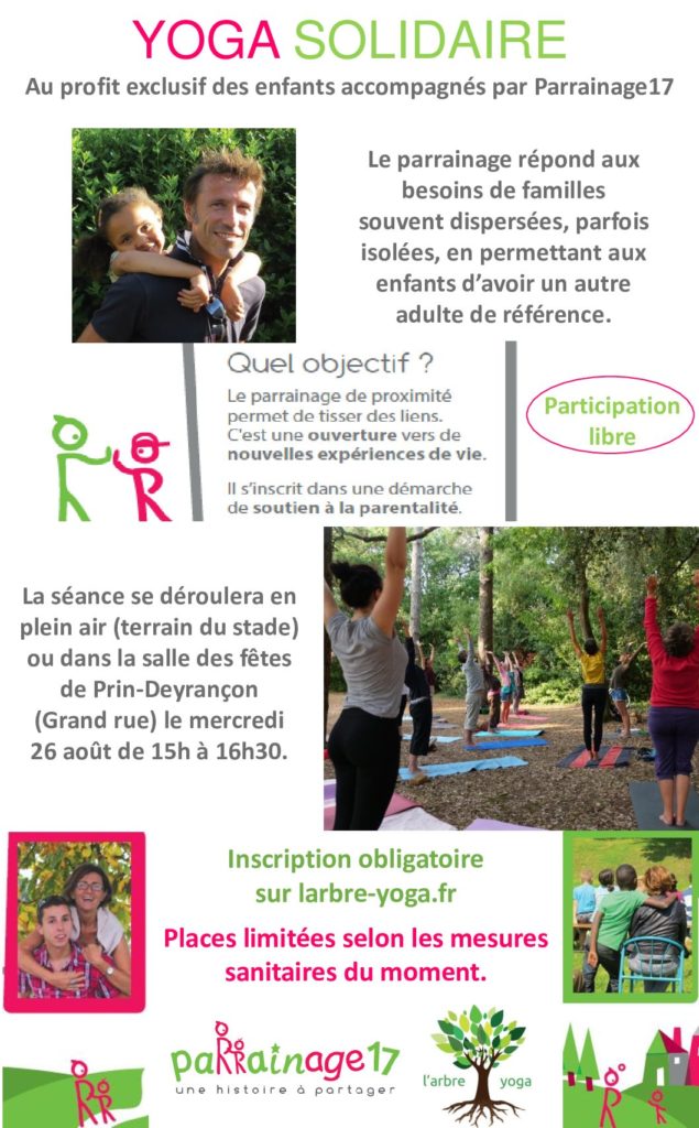 Voici ci-dessous un autre exemple de yoga solidaire déjà réalisé en 2020 dont des séances proposées fin août à Courçon, La Grève sur Mignon et Prin-Deyrançon étaient au profit exclusif de l’association Parrainage 17 : http://parrainage17.org/